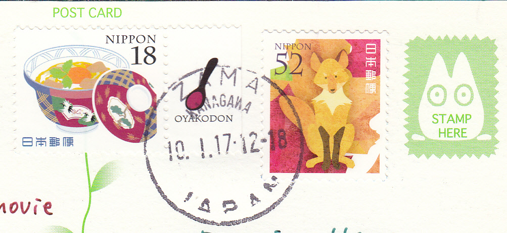 The card from Japan shows a scene from Pom Poko. Pom Poko is an animated movie produced by Studio Ghibli. It tells the story of a group of tanuki fighting against the destruction of their habitat by the humans. It was released in 1994.
