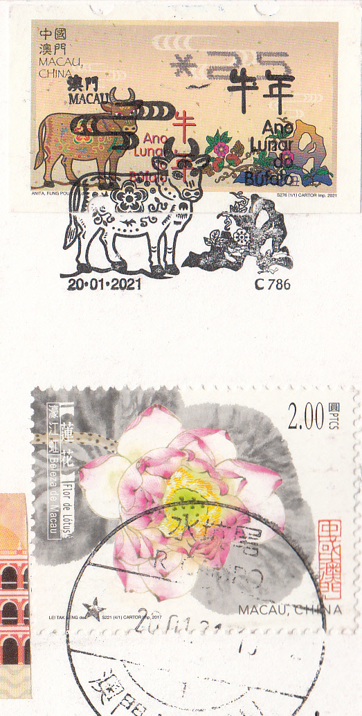 Like usual Macau Post also issued this year a set of "normal" stamps about the Chinese New Year and a label stamp. The label stamp about this Year of the Ox (issued 20-01-2021) was used on the card and got cancelled with the First Day Special Postmark. To note that this year the label stamp was issued on time, while last year it had been postponed multiple times due to Covid-19. A second stamp was used to cover the postage for a card to Germany.